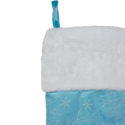 This enthralling holiday stocking is a two-in-one accent, as it can offer perfect storage space as well as an eye-pleasing decoration! It depicts a glittered snowflake and branch design with a solid satin-blue backing. Now you can stow away all the gifts of Santa Claus with ease and perfection!Product Features:Blue and white satin holiday stockingStocking has a glitter snowflake and branch design Trimmed with a white faux fur cuff Design is on front only; solid satin blue backing Comes ready to hang on a blue loop Care instructions: spot clean with mild detergent onlyDimensions: 21″ high x 10″ wide (including loop) Material(s): polyester/faux fur/glitterNote: Matching holiday tree skirt available