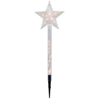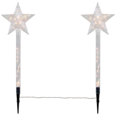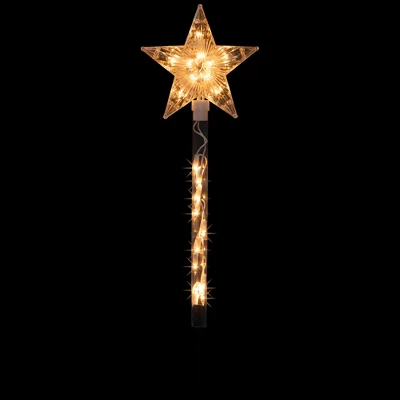 Brighten your holiday season with these festive lighted star holiday pathway markers! This 4-count set features beautiful 5-19 inch tall stars, each pre-lit with 20 clear mini incandescent lights for a dazzling display. Detachable ground stakes ensure secure placement, while end-to-end connectors allow you to connect multiple sets for an even more spectacular look. UL certified for outdoor use, these pathway markers are perfect for adding a touch of magic to your yard this holiday!Product Features:4ct star-shaped holiday pathway markersEach marker is pre-lit with 20 clear mini incandescent lights The stars are connected with a white cord Spacing between each star: 18″29″ white lead cord 4″ white tail cordLighted length: 5’Total length: 7.5’Additional Product Features:4 detachable black ground stakes included UL certified and approved for outdoor use Comes with (4) spare replacement bulbs and (2) spare fusesEnd-to-end connectors allow you to connect multiple decorations together (not to exceed 210 watts)Dimensions of each pathway marker: 19″H x 7.5″W x 2″DWith stake: 26″H x 7.5″W x 2″DMaterial(s): plastic/wire/glass
