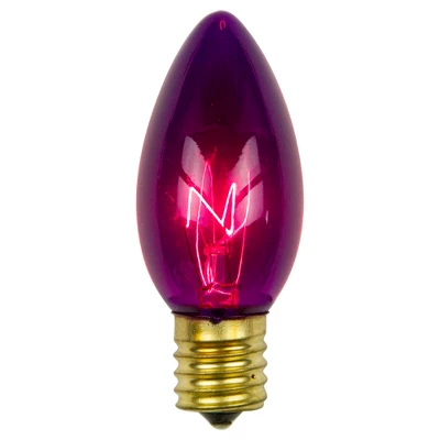 Never find yourself without a replacement bulb when a light goes out, keep yourself prepared this holiday season. There is no need to throw out an entire string of lights ever again. These bulbs are UL approved and certified for indoor or outdoor use.Product Features: Finish: transparentColor: purpleBulb size: C9IncandescentE17 brass base UL approved and certified for indoor or outdoor use 120 volts, 5 wattsDimensions: 3.25″ high x 1″ diameterMaterial(s): glass
